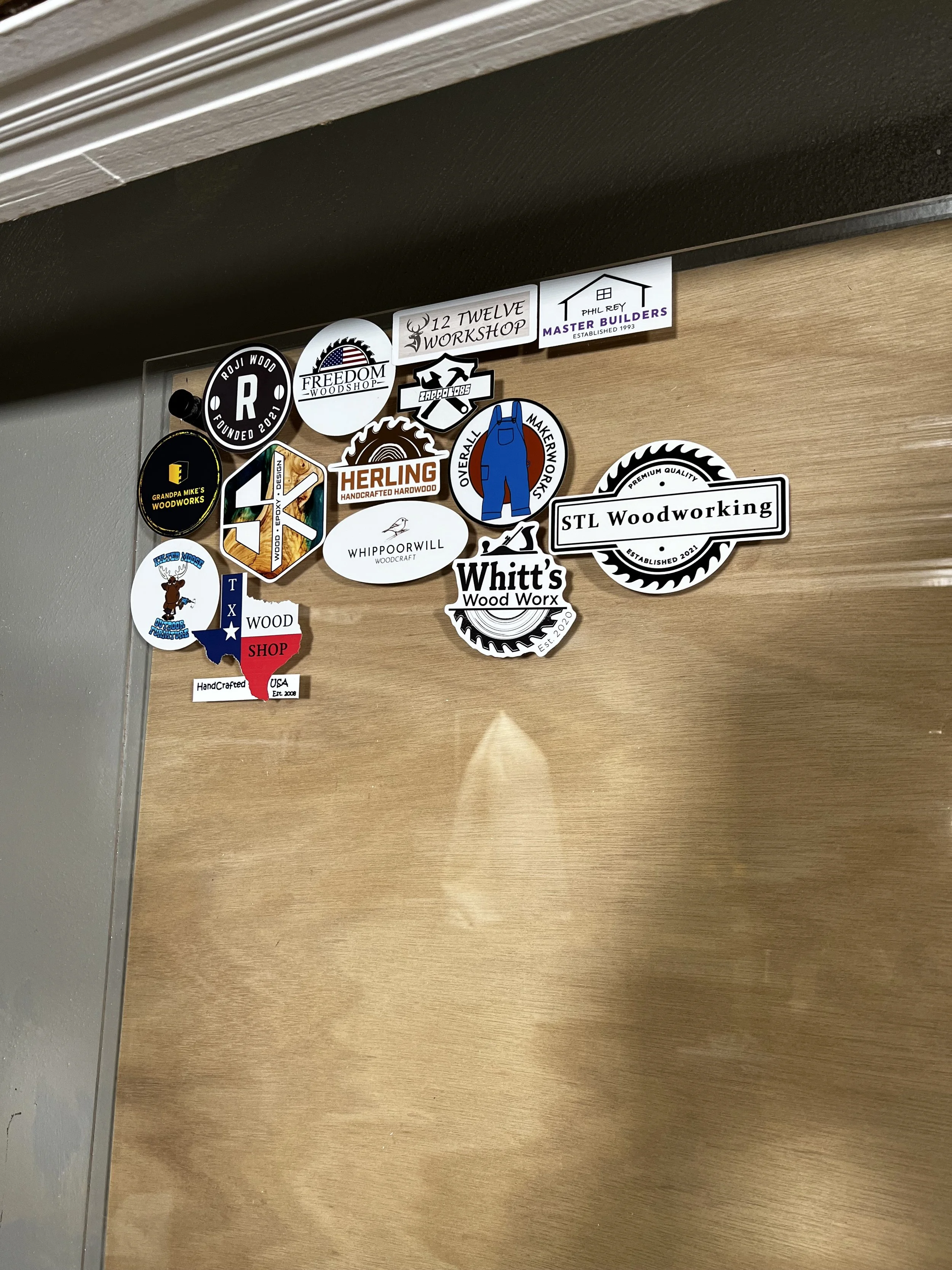 After seeing many other woodworkers and makers sticking the stickers of others on tools and cabinets, I wanted something that could move with me as necessary and something I wouldn’t grow out of or need to get rid of like a tool or cabinet. I came up with this simple sticker wall display using some leftover ¼’ plywood, an extra panel of acrylic I had purchased for another project and some small fasteners that I have linked to on my recommended tools and hardware page.