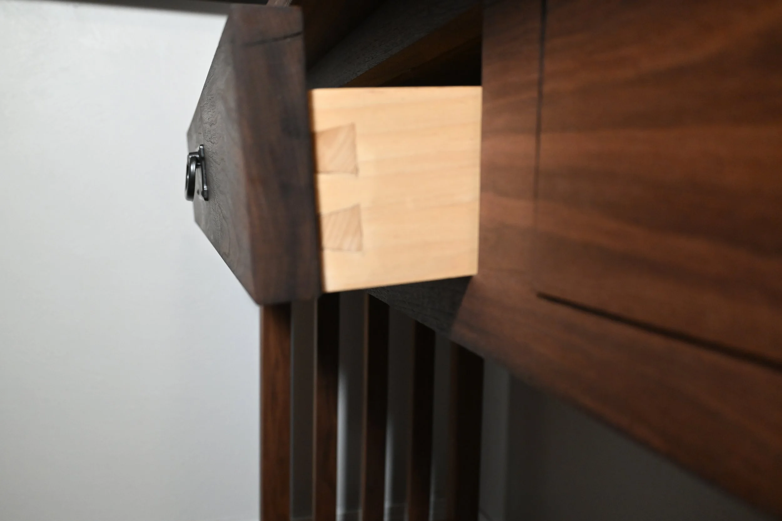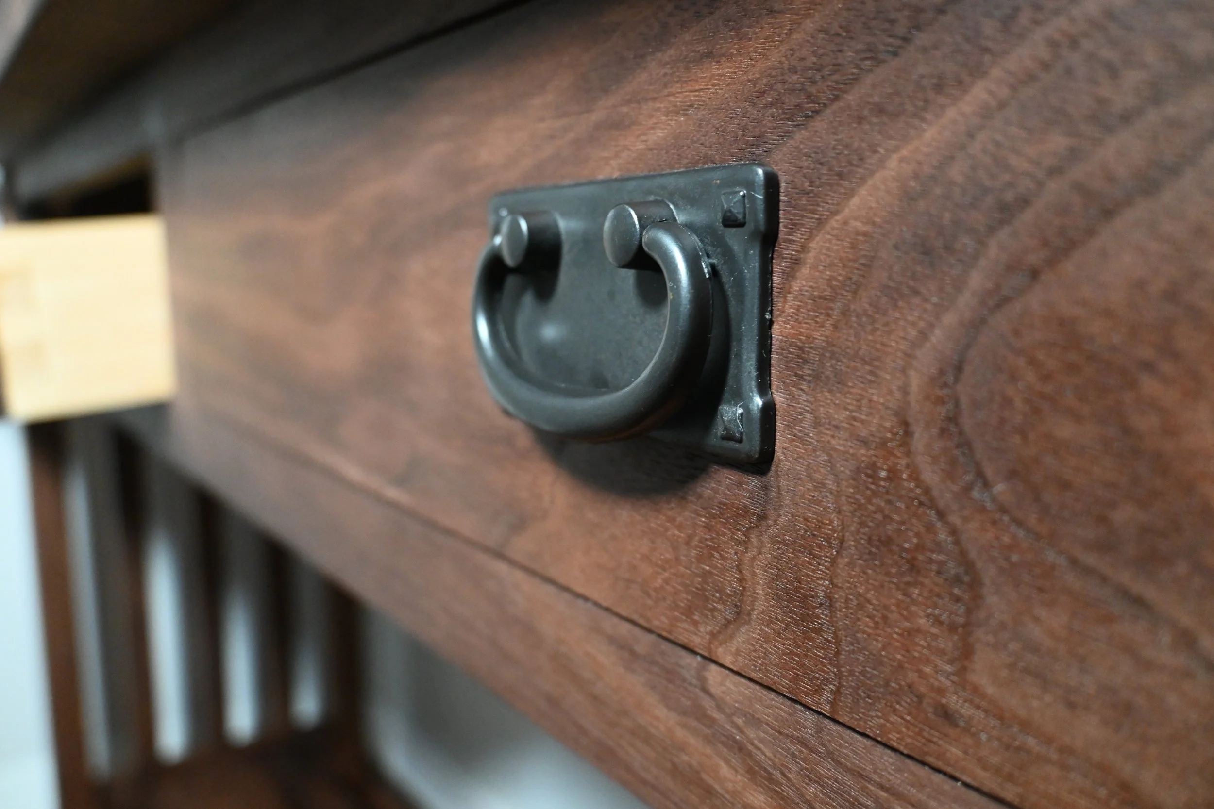 For this piece, Walnut is used for the majority, with Poplar used as the secondary wood for the drawer sides and drawer bottoms. The drawer bottoms float within their grooves to allow for wood movement that plywood drawer bottoms inherently avoid but solid wood drawer bottoms add a touch of finer quality in my opinion. Another slight deviation from tradition, the side slats and legs feature shaping done by hand with a block plane to add character. Most significantly to the character of this table is the continuous grain front skirt and drawer fronts. You can easily follow the grain pattern across all of the front skirt broken only by small reveals around the drawer faces and the mission style drawer pulls used.